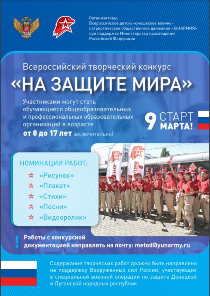С 9 марта по 8 апреля Движение «ЮНАРМИЯ» запускает Всероссийский творческий конкурс «На защите мира» в поддержку российских военных, которые участвуют в спецоперации по защите Донецкой и Луганской народных республик. Участвовать могут школьники от 8 до 17 лет.