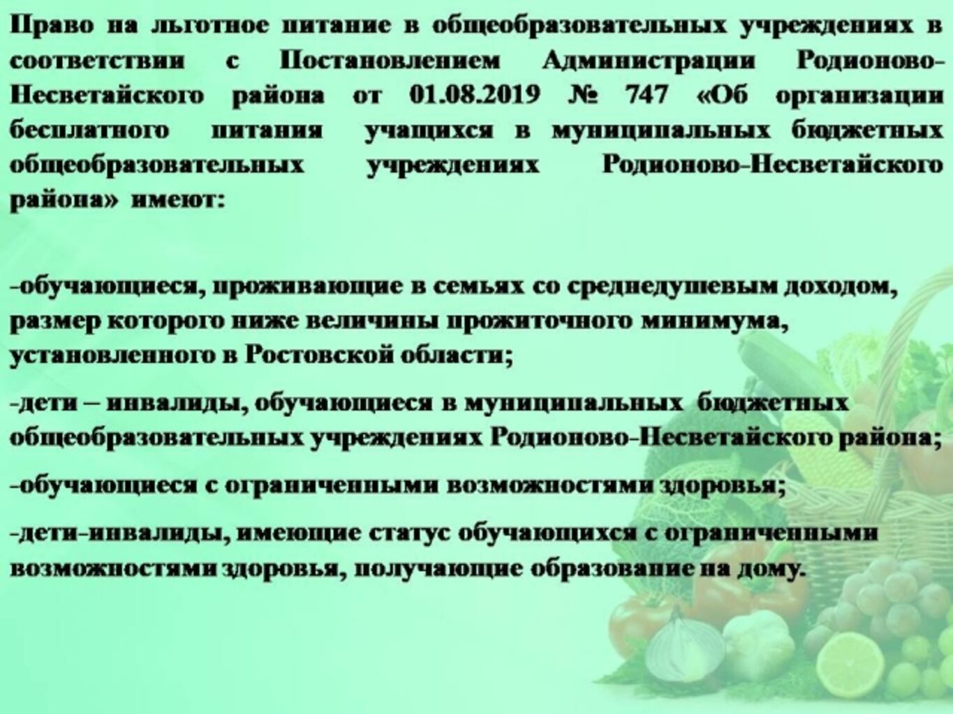 Постановление Администрации Родионово-Несветайского района "Об организации бесплатного питания учащихся в муниципальных бюджетных общеобразовательных учреждениях Родионово-Несветайского района" №747 от 01.08.20 г.